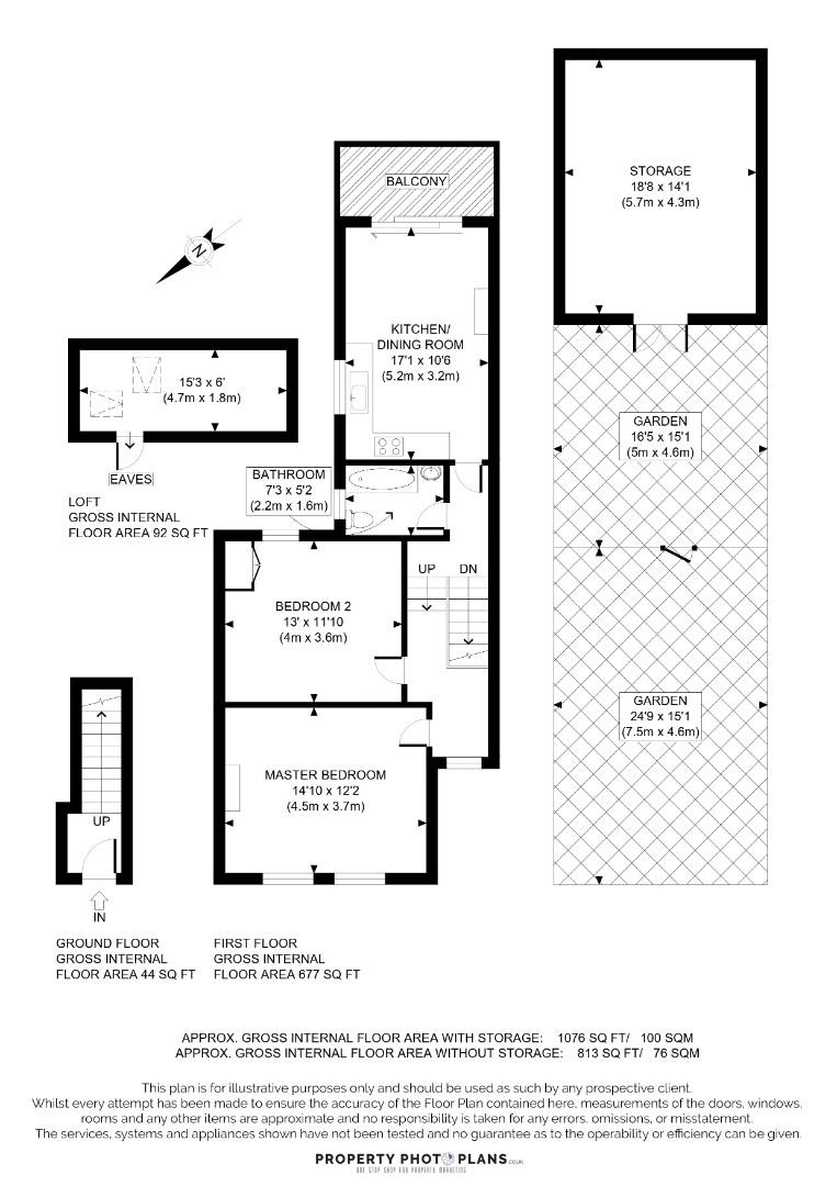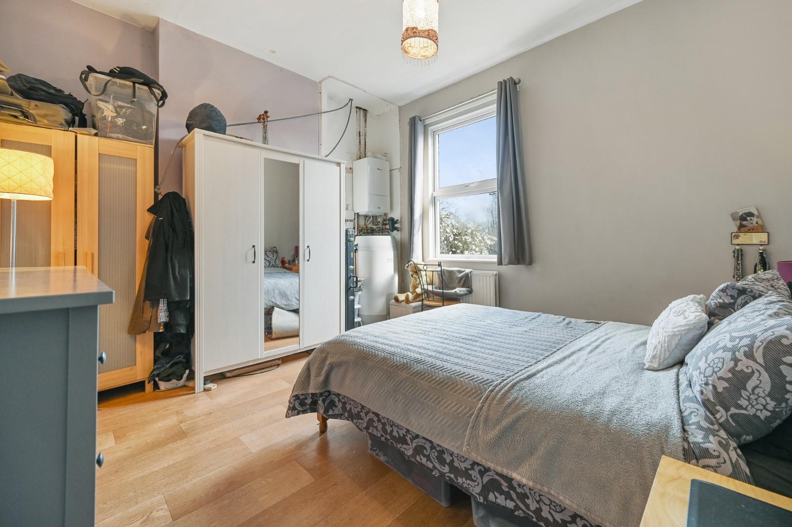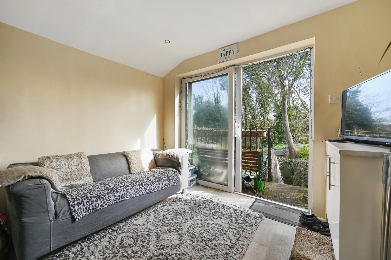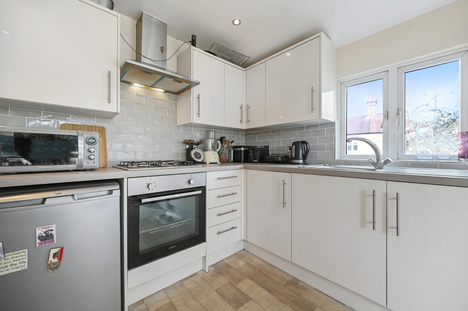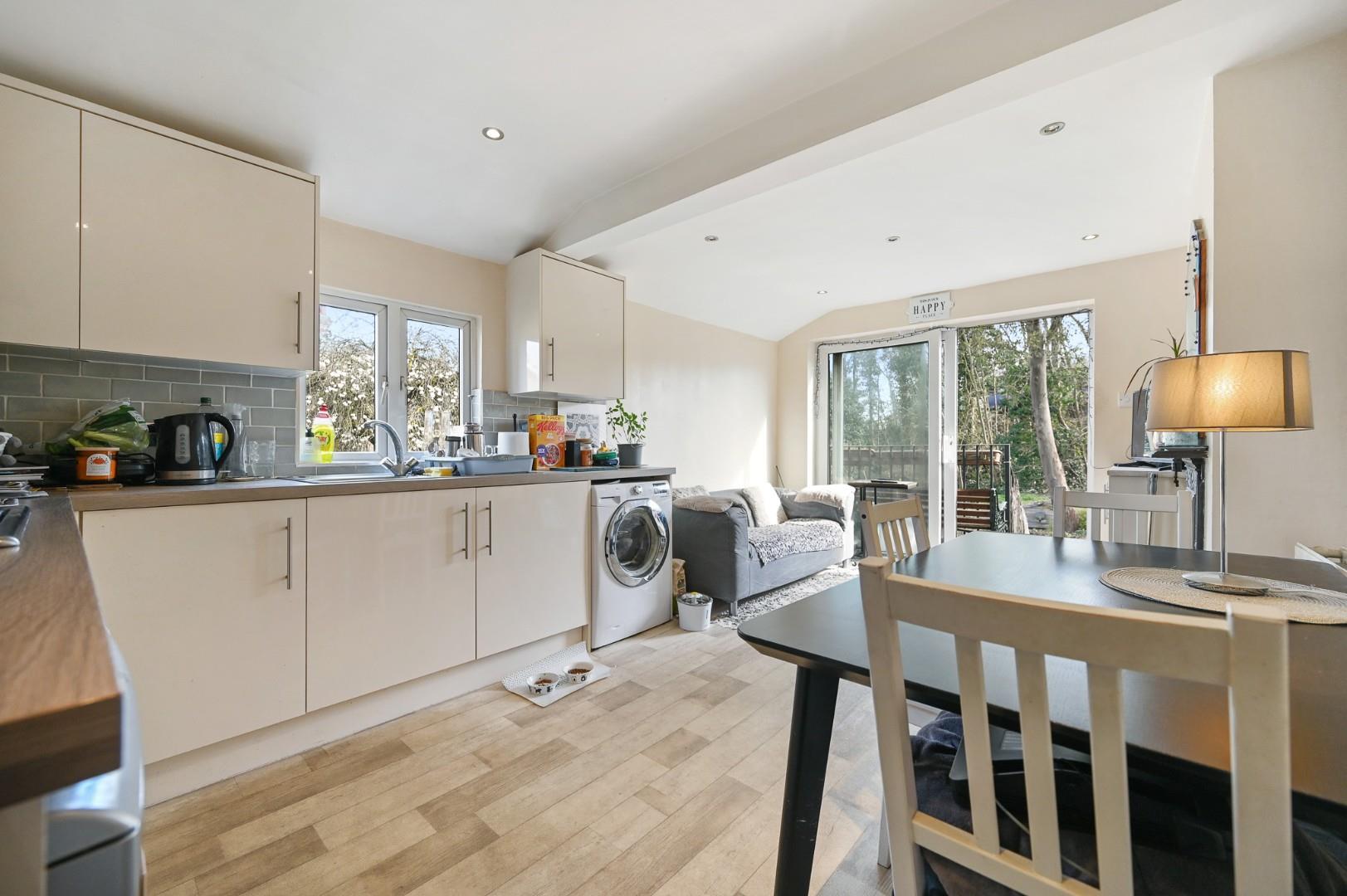 This lovely property is brought to the market and sold without any onward chain and with a share of the freehold, and accommodation comprises a welcoming hallway, two double bedrooms, a bathroom and an open plan kitchen/lounge diner which has doors leading to a balcony and stairs down to the very spacious private rear garden. Further benefits include loft space, which could provide further extension potential (subject to planning).