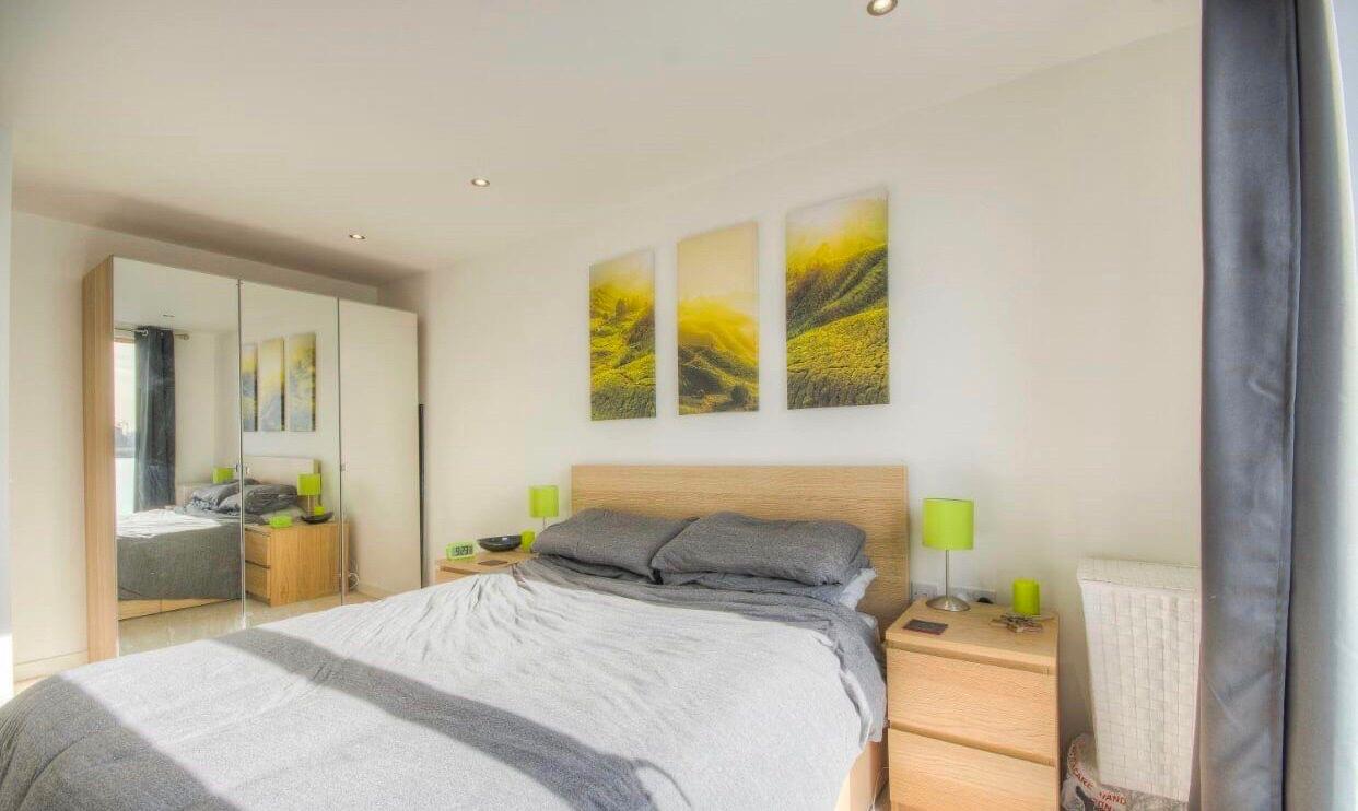 The double bedroom offers generous space and includes a double fitted wardrobe and access to the terrace, which provides views of the London skyline – including The Shard and BT Tower.