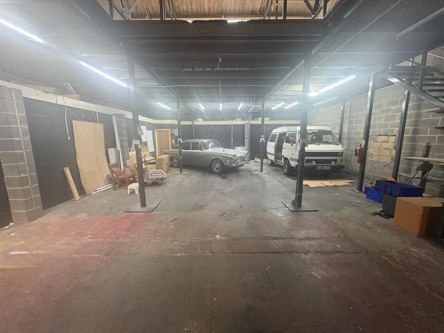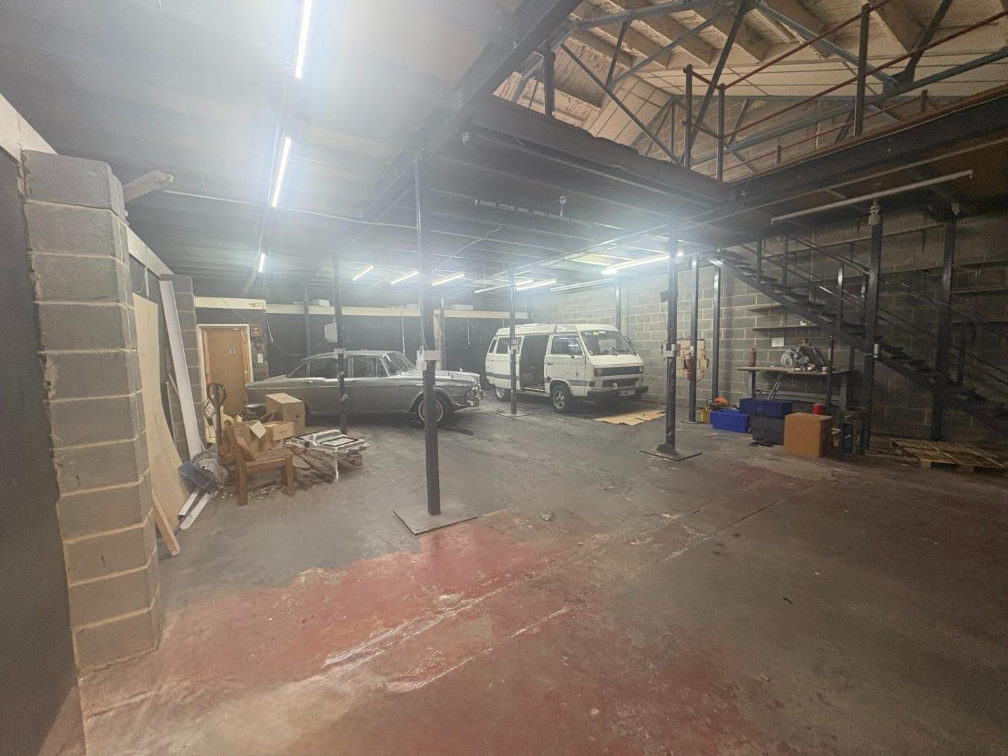 The unit benefits from a large open-plan ground floor workshop with excellent floor-to-ceiling height, suitable for vehicle access and heavy-duty operations. A full mezzanine level provides additional storage or workspace, maximising the usable area.
